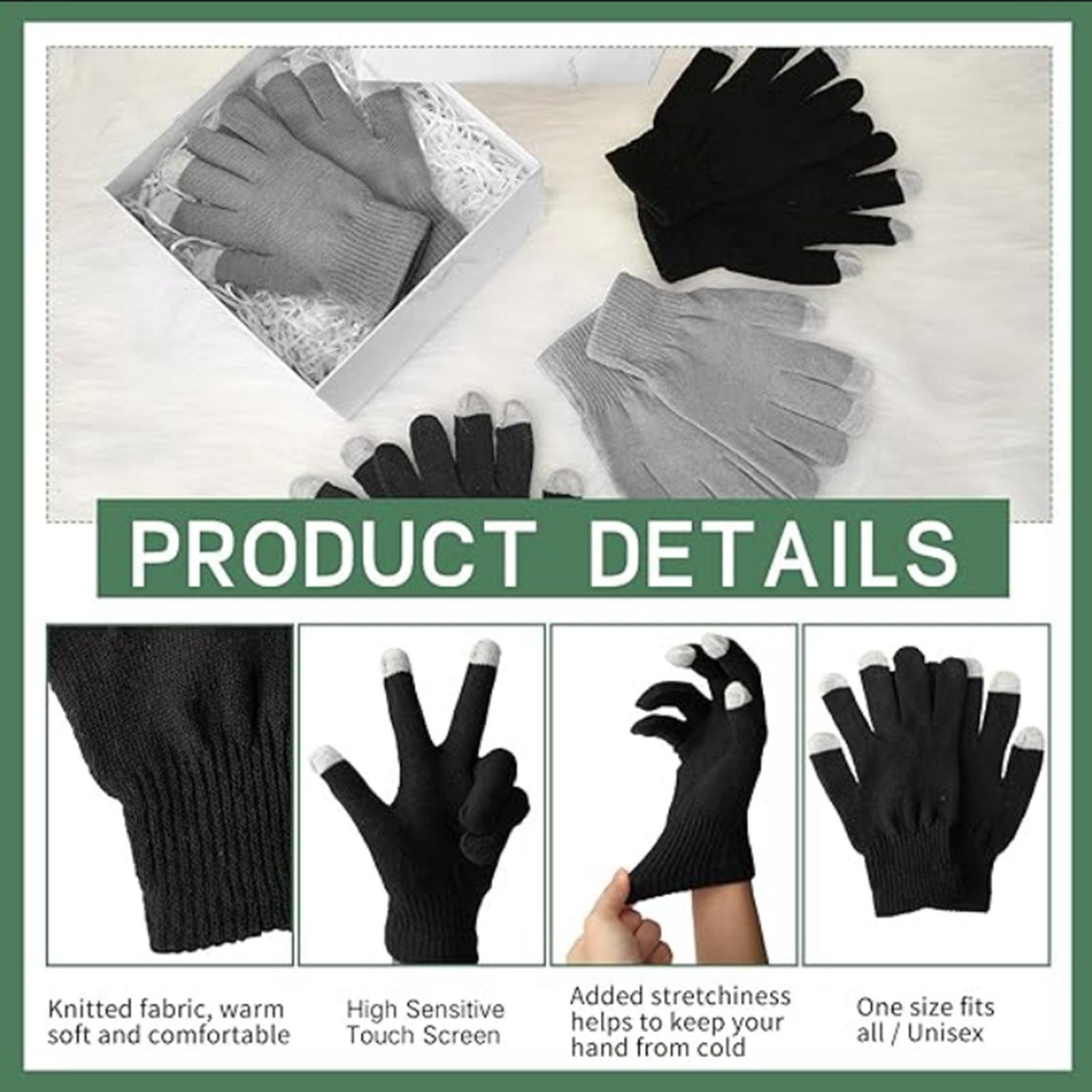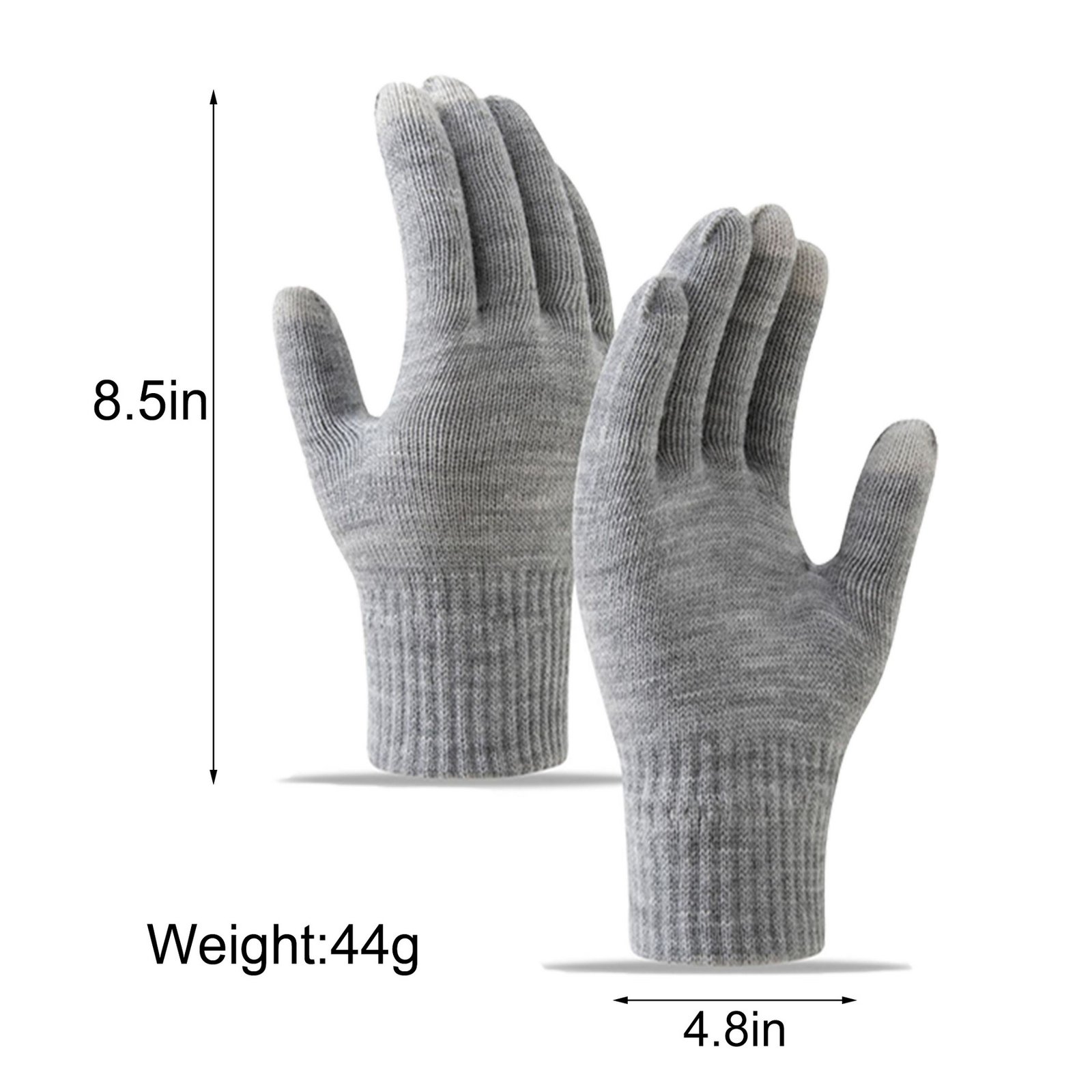 These touchscreen knit gloves are perfect for winter sports like cycling, skiing, and fitness activities. Crafted from soft, warm wool, they feature a snug fit and conductive fingertips for easy device use. Available in black, navy, beige, gray, red, pink, and white, they offer style and warmth. Ideal for keeping hands cozy during cold weather, they are durable and versatile for outdoor enthusiasts. 8.5″ D x 4.8″ H